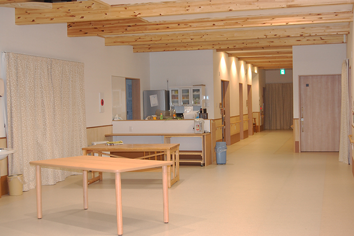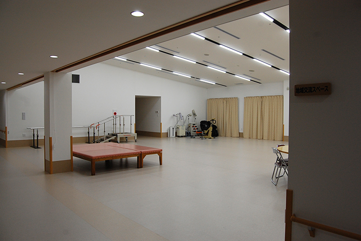 廊下と広場と一体的な空間になっています。慰問や園内行事を地域交流スペースを使って、地域との交流の場になっています。また各種研修会会場の場としても提供しています。