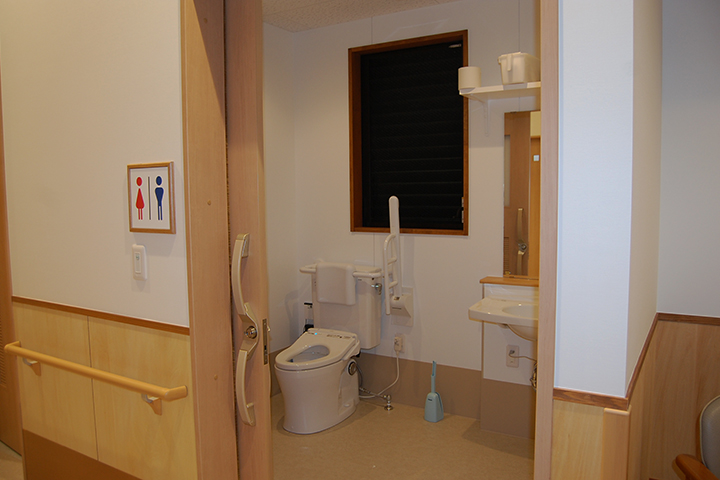 ユニット棟にあるトイレ。障がいを持つ方でも安心してご利用いただけるように設置しています。また移動の際、手すりを必要としている麻痺がある利用者を考慮し、ユニット内にあるトイレはそれぞれ左右対称に設置しています。
