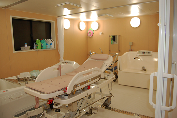 ニット棟にある浴室。寝たきりの方でも座位ができる方でもその利用者に合った入浴ができるように特殊浴槽と個浴槽をすべてのユニット棟に設置しています。